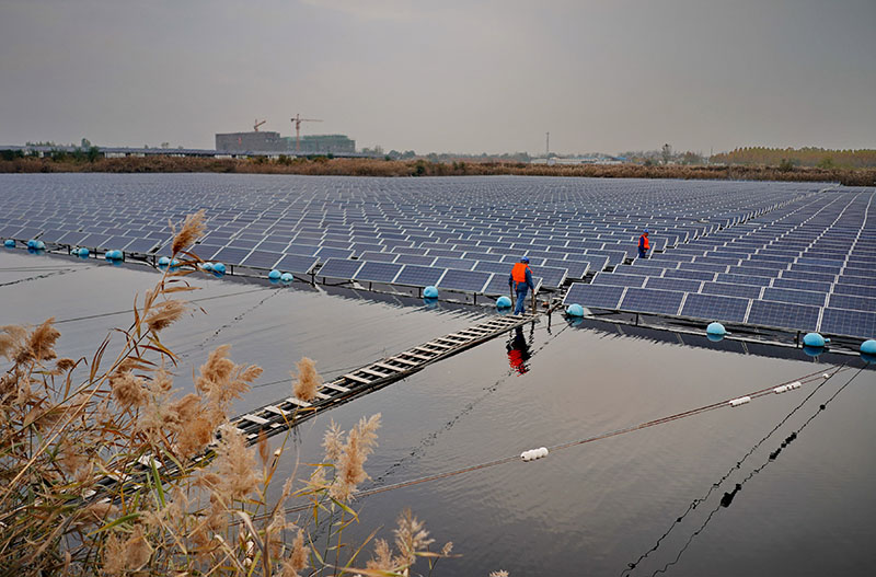 11月13日,工人在臨西縣靈溪湖水上光伏發電場巡查。