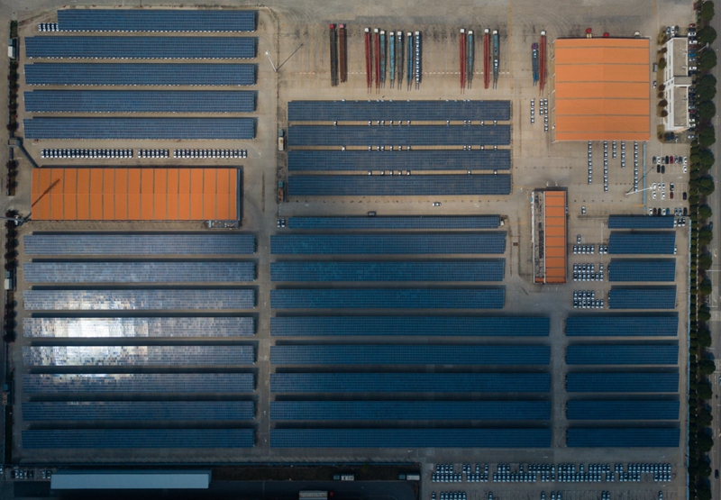 這是3月26日拍攝的上海大眾汽車南京分公司廠內的光伏車棚(無人機航拍)。